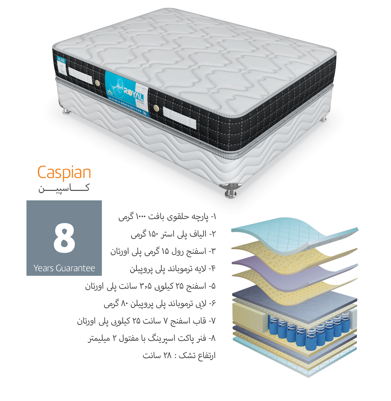 تشک مدل کاسپین برند رویال در دسته تشک های طبی فنری قرار می گیرد که فنر بکار رفته در ساختار آن از نوع فنر منفصل یا همان فنر پاکتی است. فنر مفنصل از محبوب ترین فنرها در بین انواع فنرهای تشک می باشد و ساختار آن بگونه است که فنرهای بکار رفته در تشک عملکرد جداگانه و مستقل از یکدیگر دارند. این عامل در افزایش پشتیبانی تشک از ستون فقرات موثر است. همچنین به دلیل عملکرد جداگانه فنرها در تشک های دونفره مدل کاسپین، حرکت های یک نفره به نفر دوم منتقل نمی شود. در تشک مدل کاسپین چندین لایه متراکم اسفنج پلی اورتان، لایه ی ترموباند پلی پروپیلن و رول های اسفنجی پلی اورتان در جای مناسب خود بکار رفته اند که از عوامل طبی بودن تشک کاسپین هستند. میزان سفتی این تشک دارای نمره ی ۷ از ۱۰ است و در دسته تشک های نسبتا” سفت قرار می گیرد. اما نکته ی مثبت این تشک این است که یک روی تشک نسبت به روی دیگر نرم تر است و در صورت نیاز می توان با پشت و رو کردن تشک میزان سفتی تشک را تغییر داد. ضخامت تشک کاسپین در حدود ۲۸ سانتیمتر است. تشک کاسپین دارای ضمانت نامه ی ۸ ساله از شرکت رویال است.